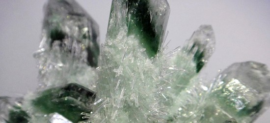 また、こちらは中国の合成グリーンクォーツのクラスターです。緑の合成を成長させ、その上にさらに無色のクォーツを成長させてファントムにし、さらに条件を変えて小さな結晶を成長させて天然のような棘棘したクラスターになっています。